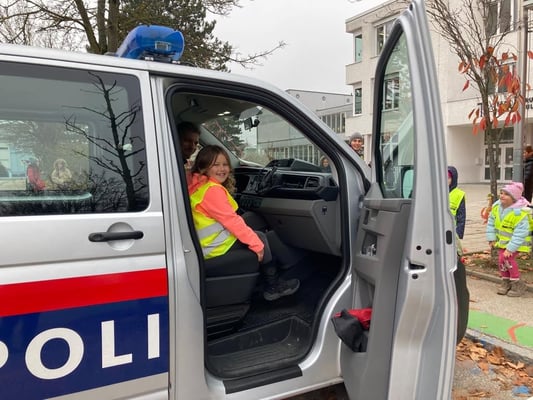 Die 1b bekam Besuch der Polizei Traun und die Kinder konnten dem Polizisten zeigen, dass sie bereits sicher eine Strasse überqueren können. Als Belohnung durfte sich jedes Kind anschließend noch ins Polizeiauto setzen und sogar das Blaulicht einschalten.