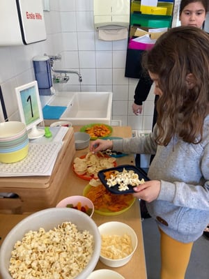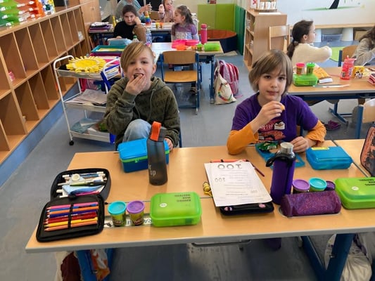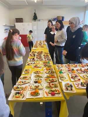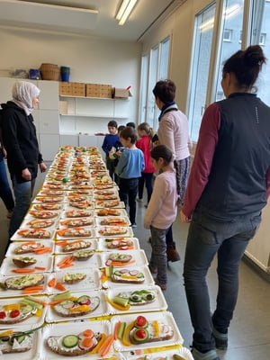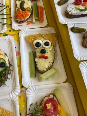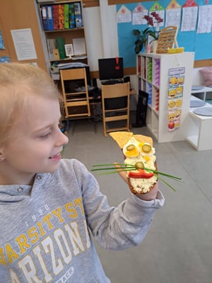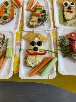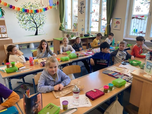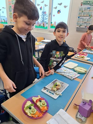 Mit großer Freude bereiteten die Kinder der ersten Klassen und DFKL die verschiedenen Leckereien zu. Es gab Butterbrote mit Kresse, Brote mit Kartoffelkäse oder Topfenaufstrich, Ostereier, Obstspieße, Kuchen und so weiter. Diese konnten in der Jausenpause von der ganzen Schule gekauft und gegessen werden.
